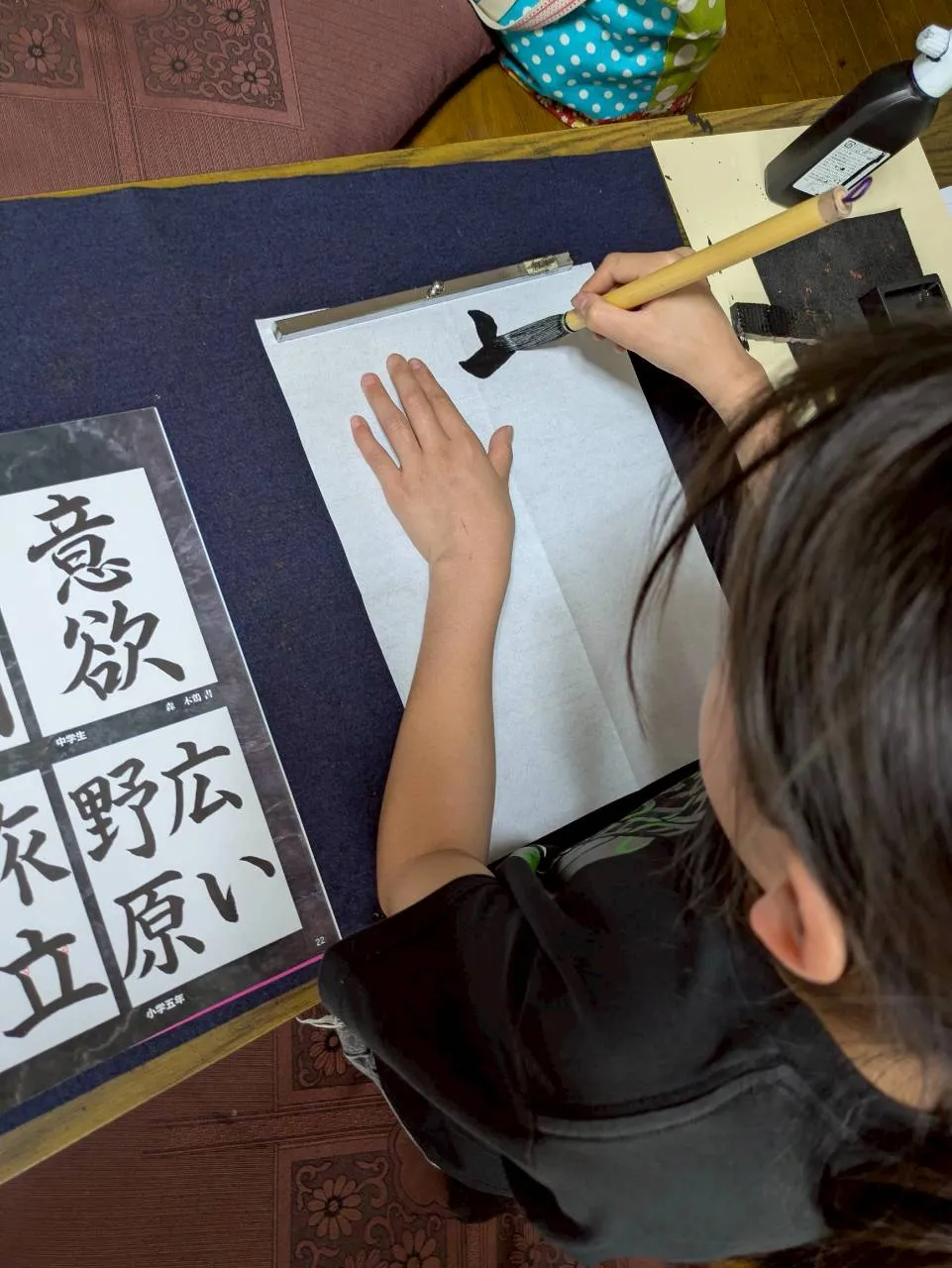 - 毛筆: 「意欲」という文字に挑戦!一画一画に魂を込め、力強い筆運びが見られました。